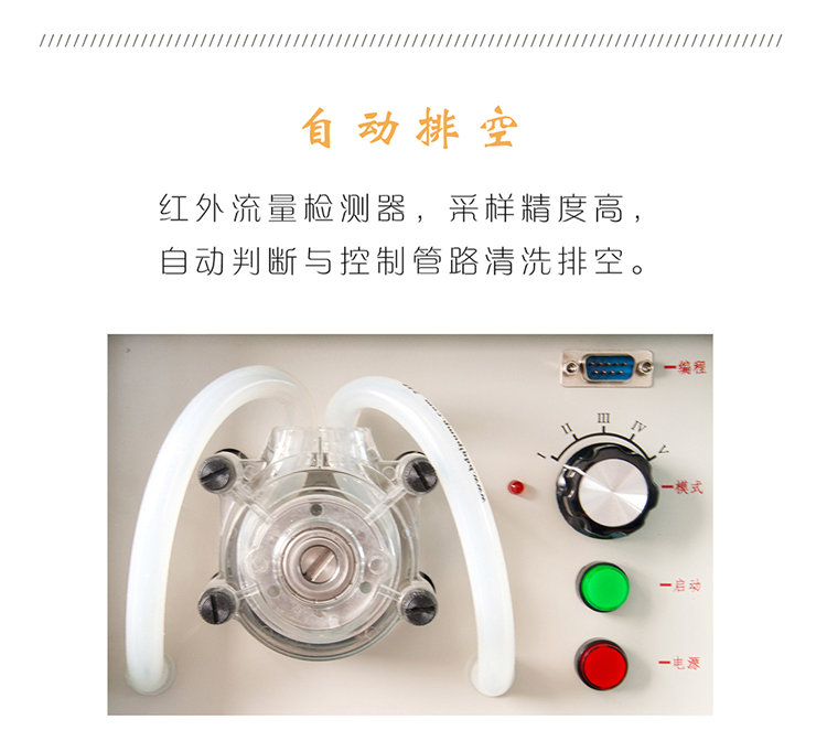 2、紅外流量檢測器,采樣精度高,自動判斷與控制管路清洗排空;