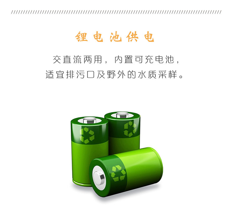 5、交直流兩用,內(nèi)置可充電池,適宜排污口及野外的水質(zhì)采樣;