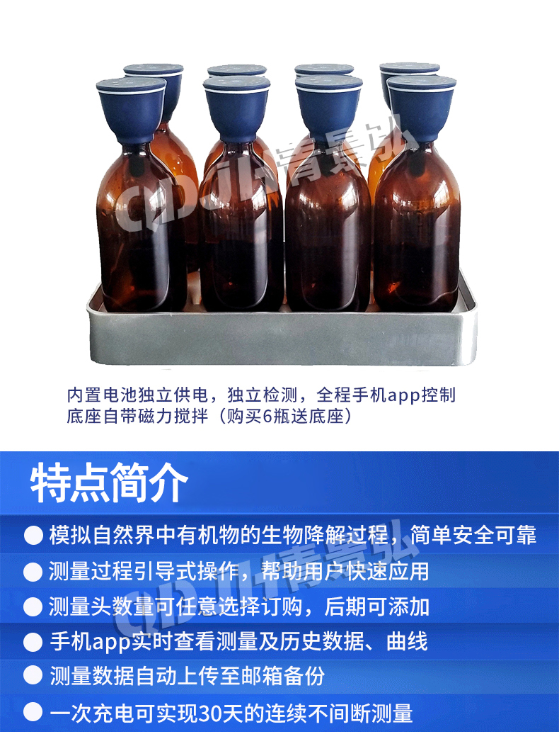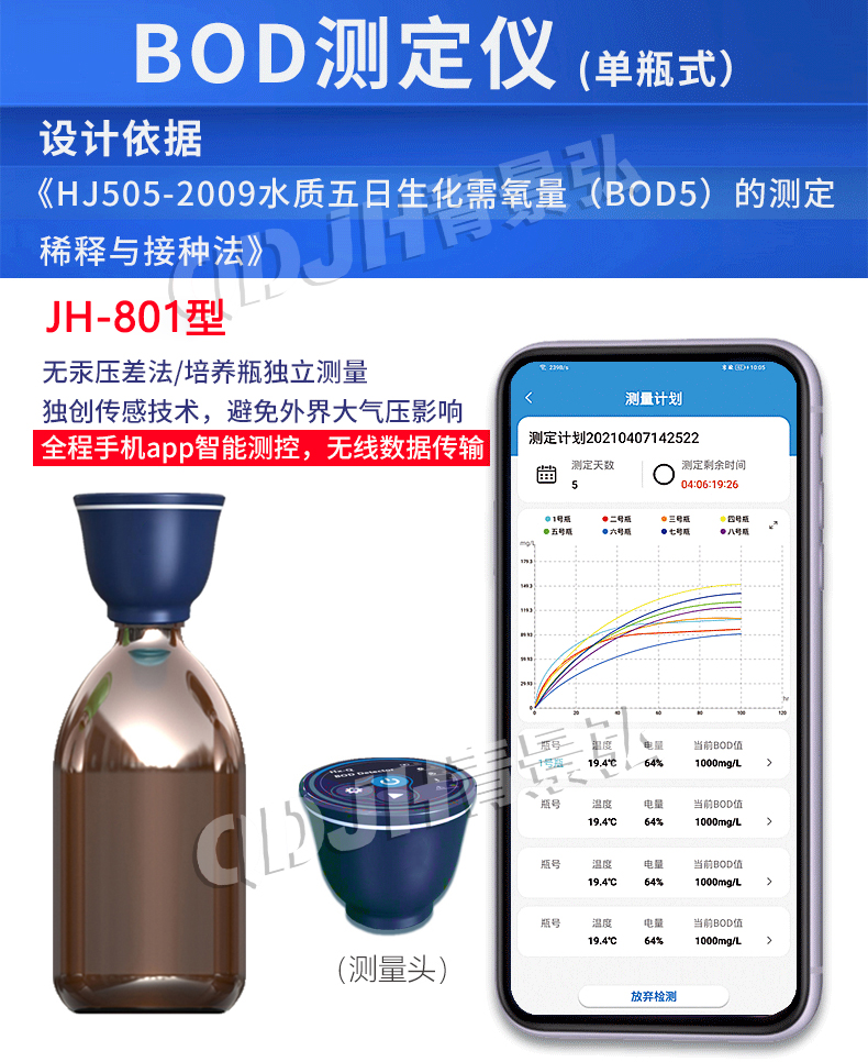 JH-801型BOD測(cè)定儀是根據(jù)國(guó)標(biāo)《HJ505-2009 水質(zhì) 五日生化需氧量(BOD5)的測(cè)定 稀釋與接種法》規(guī)定,模擬自然界中有機(jī)物的生物降解過(guò)程,采用簡(jiǎn)單、安全、可靠的無(wú)汞壓差感測(cè)法測(cè)量水質(zhì)BOD值。儀器采用智能測(cè)控技術(shù),測(cè)量全過(guò)程通過(guò)手機(jī)APP進(jìn)行控制、查看,無(wú)線數(shù)據(jù)傳輸,可實(shí)現(xiàn)多組設(shè)備的自動(dòng)重連匹配,方便實(shí)時(shí)查看測(cè)定數(shù)據(jù)結(jié)果??蓮V泛適用于環(huán)境監(jiān)測(cè)站、第三方檢測(cè)機(jī)構(gòu)、科研、高校以及污水排放企業(yè)等。