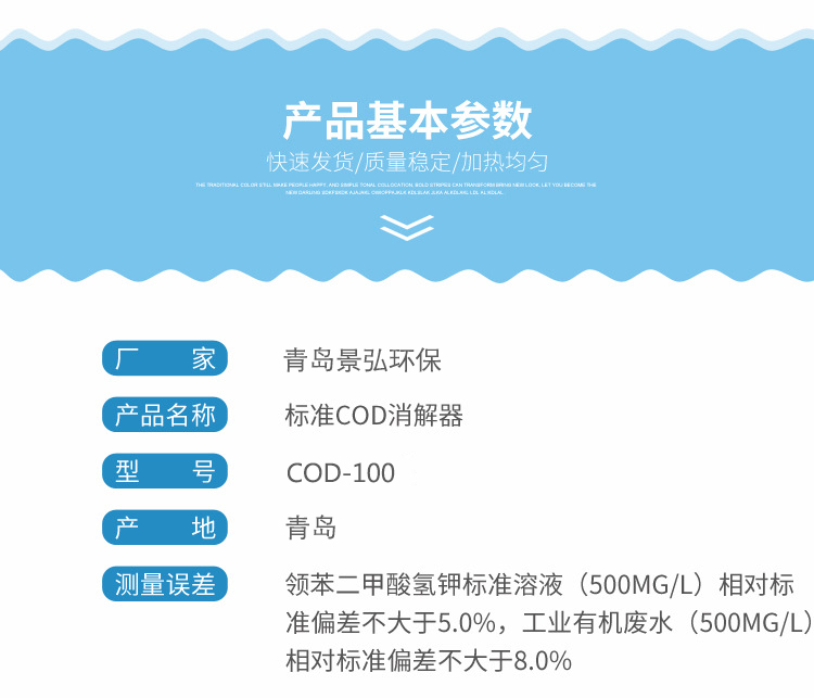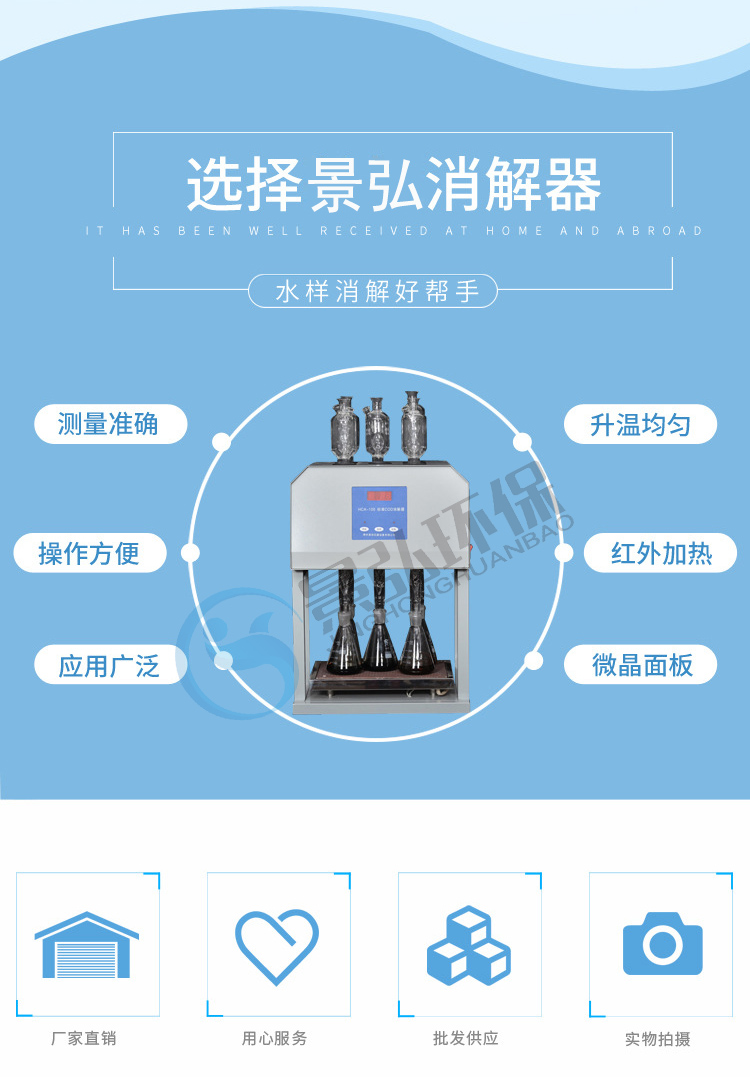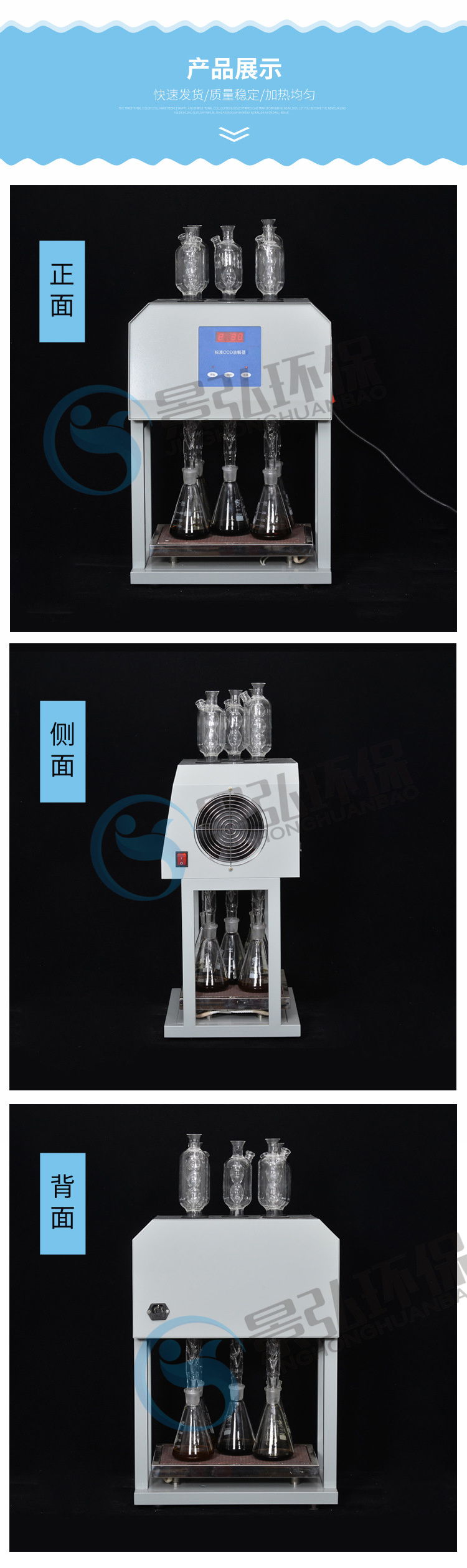 儀器的化學(xué)溶液配制、操作和COD的計(jì)算遵照GB11914-89,低于50mg/L的COD水樣可通過稀釋滴定劑和氧化劑來提高精確度,高于1000mg/L的COD水樣,可通過水樣的比例稀釋來完成測定。